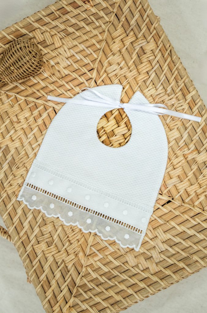Babero cuadrado de piqué con rizo impermeable y tira bordada con detalle de bodoques.