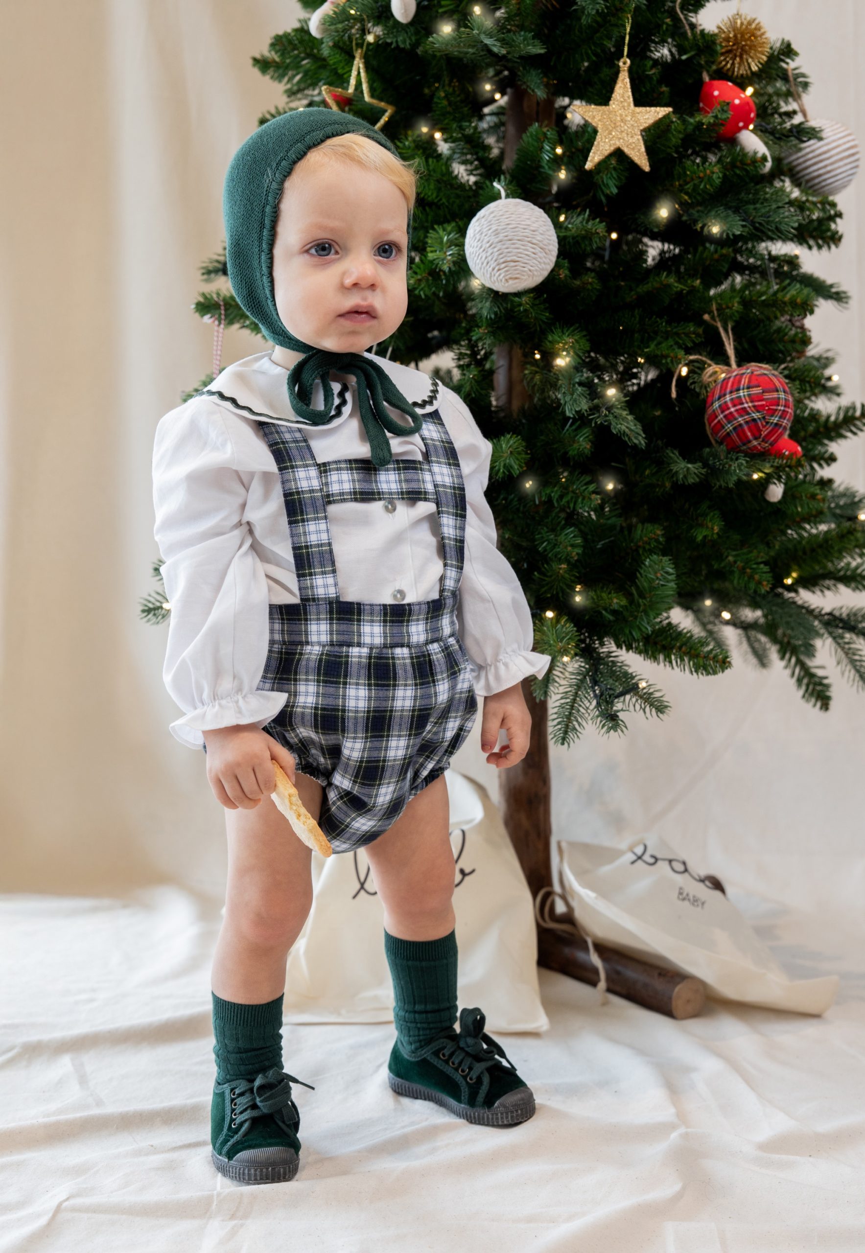 Camisa de algodón 100% de manga larga con cuello bebé y detalle de ondulina en terciopelo en verde botella.