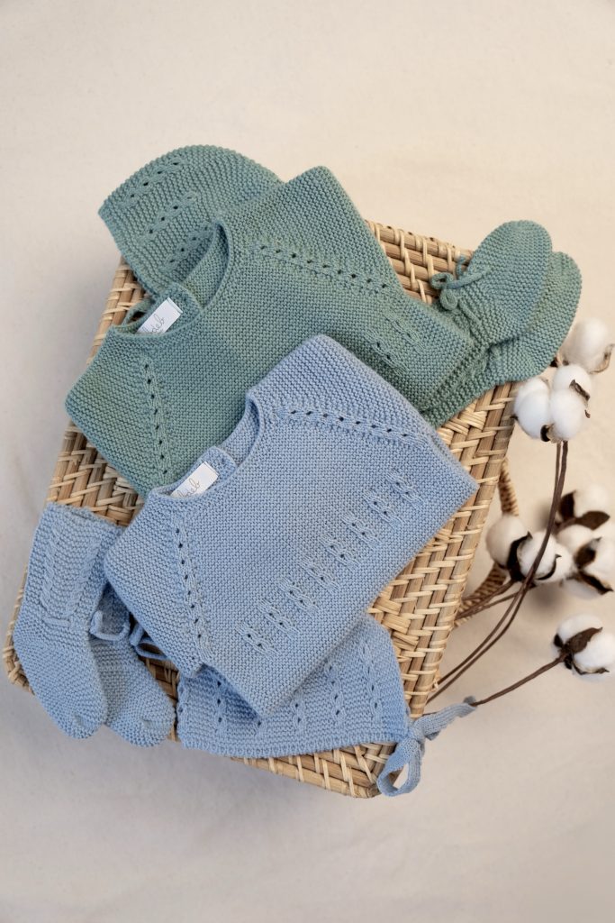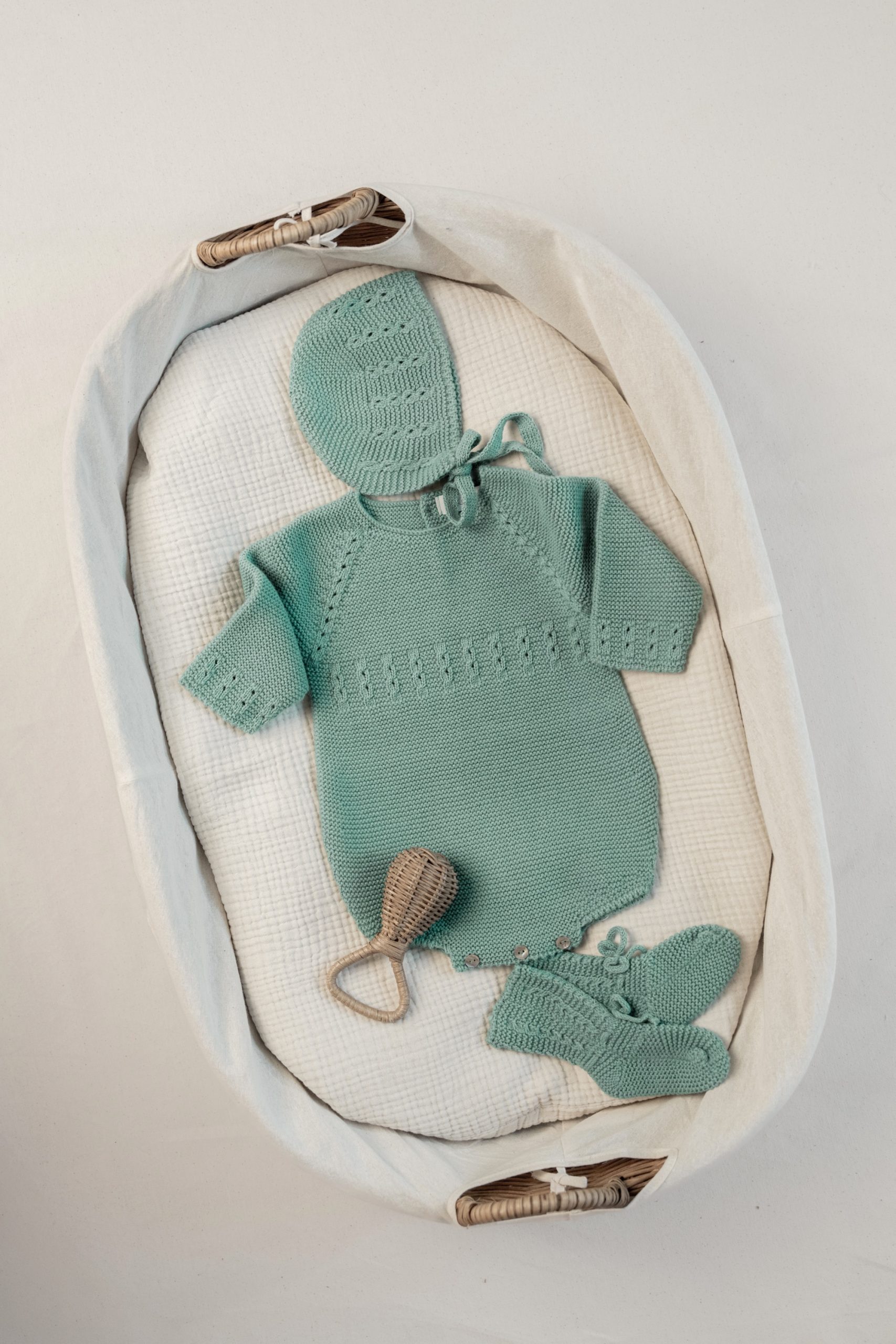 Conjunto de capota, pelele y botitas con detalle de ochitos.