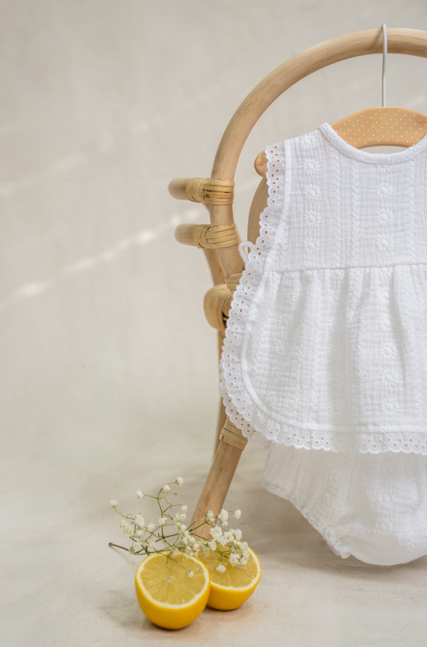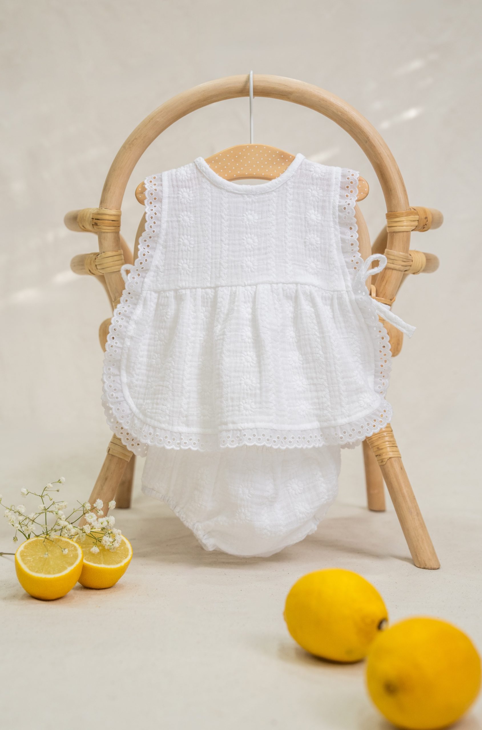 Detalle de tira bordada en todo el contorno. Canesú y lazadas laterales como sistema de cierre. Se abrocha en la espalda con botones de nácar.
