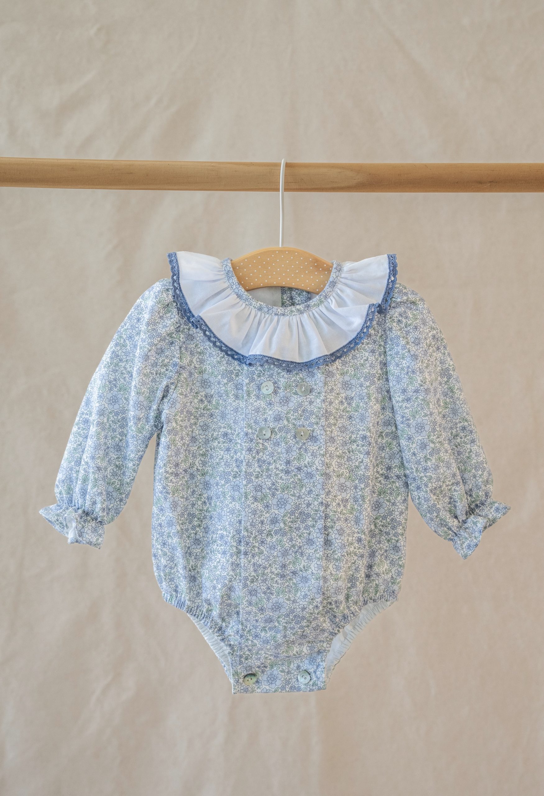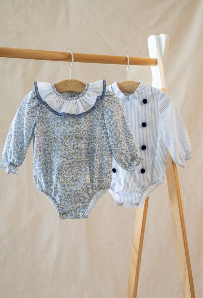 El muslo lleva goma blanda para no dañar la piel del bebé y lleva botones de nácar en la entrepierna para facilitar el cambio de pañal.