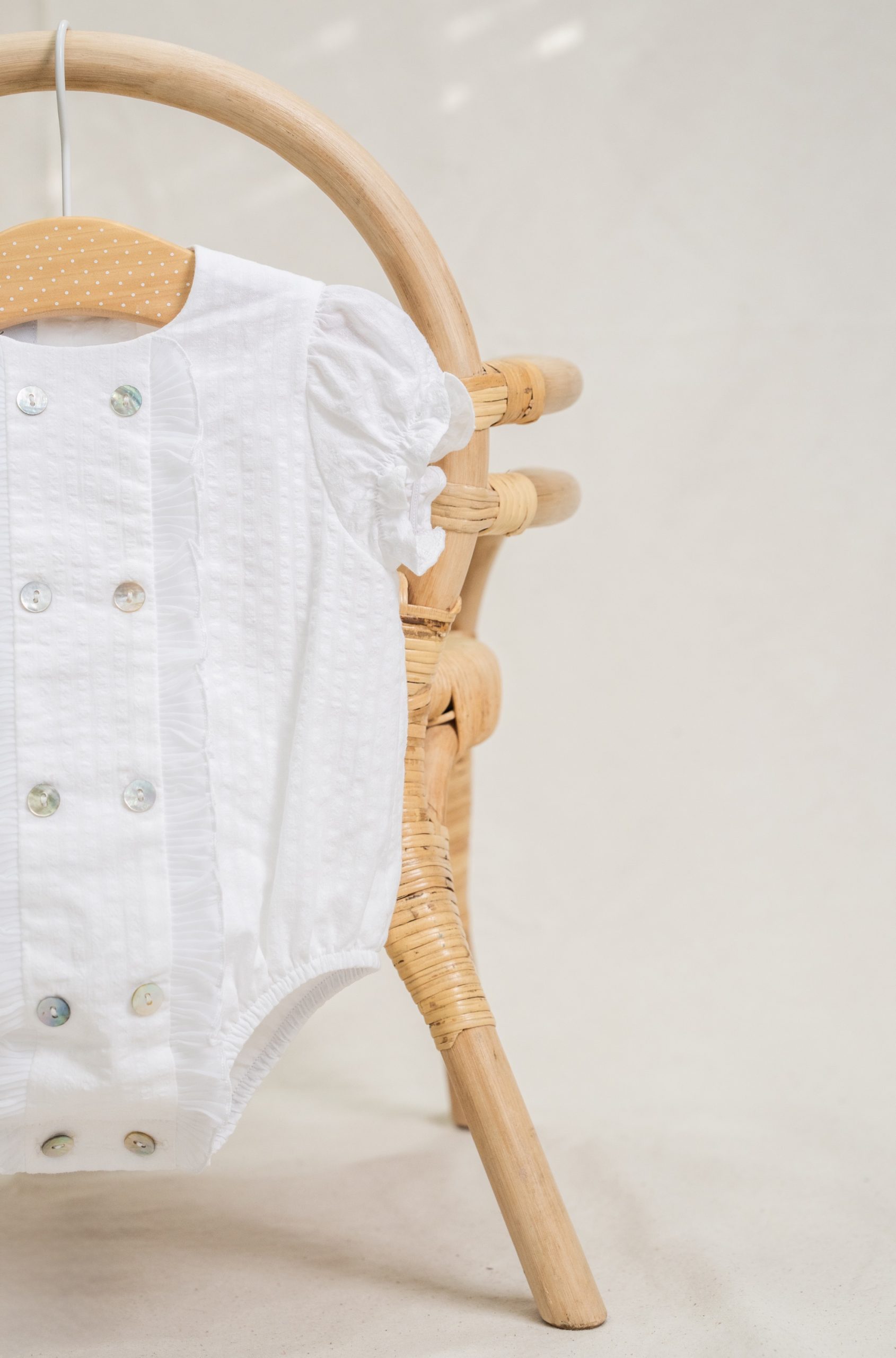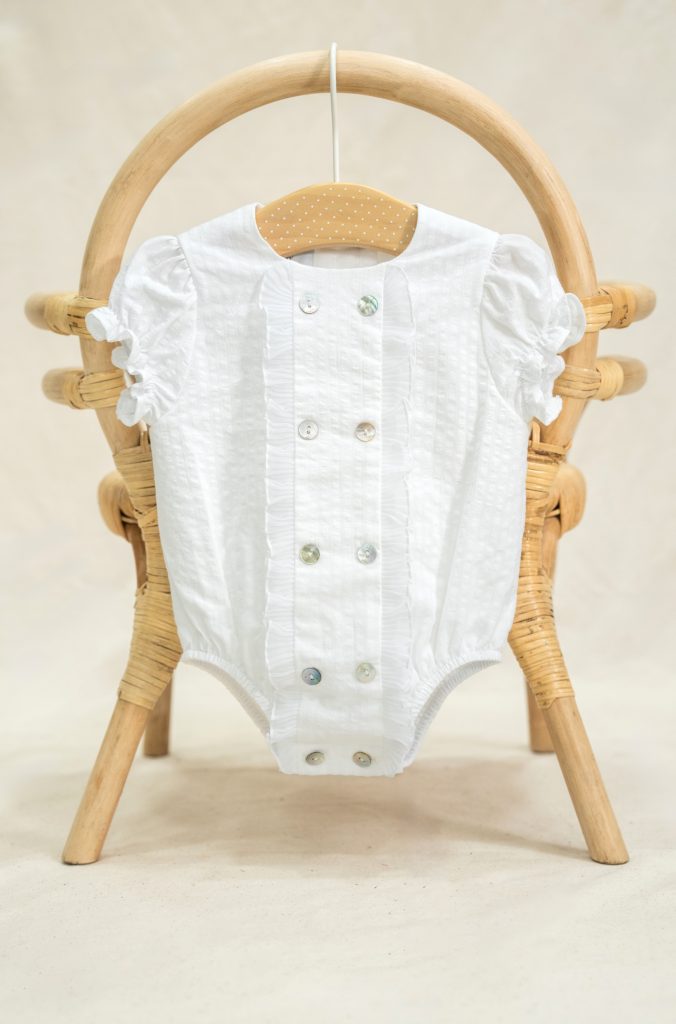 El muslo lleva gomas muy finitas que no aprietan a los bebés y lleva botones de nácar en la entrepierna para facilitar el cambio de pañal.