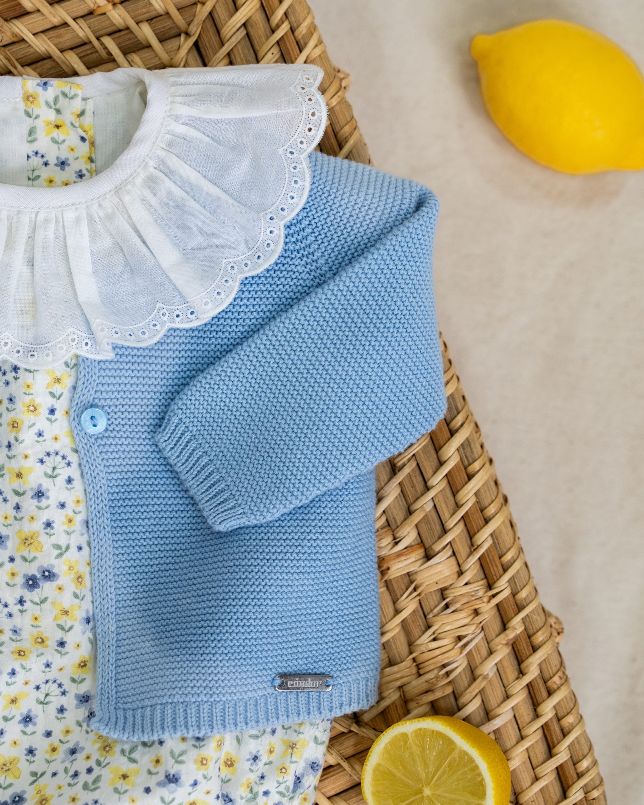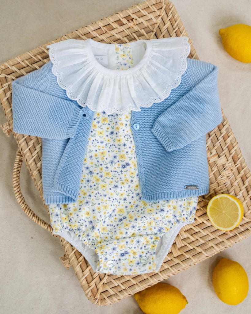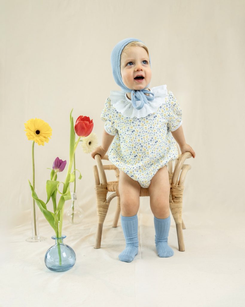 Tanto el puño como el muslo llevan goma blanda para no dañar la piel del bebé y lleva botones de nácar en la entrepierna para facilitar el cambio de pañal.
