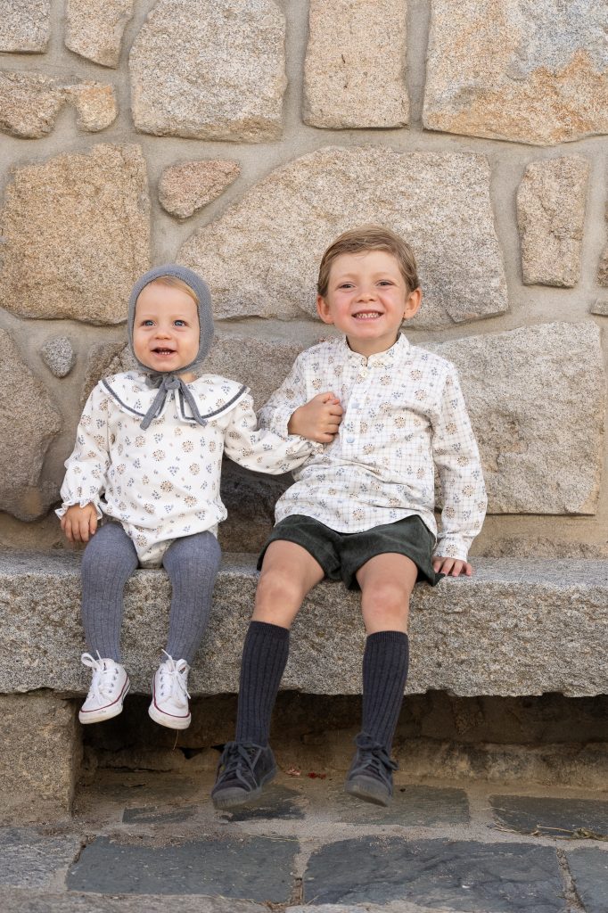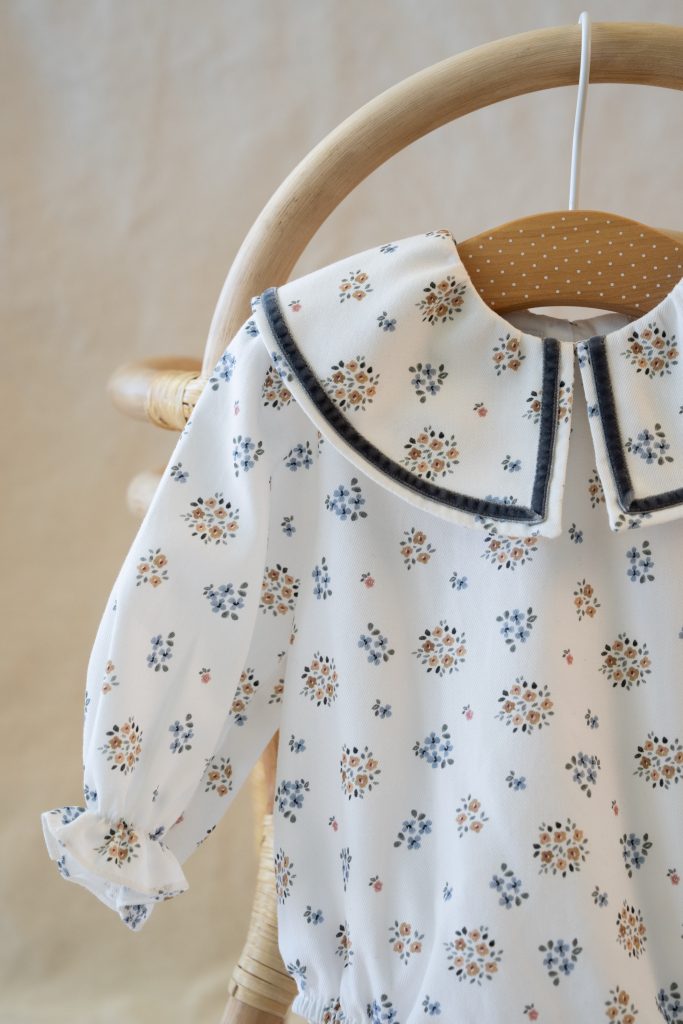 Cuello babero rematado con tira de terciopelo que le da un toque muy especial. Manga ligeramente abullonada. Se abrocha en la espalda.