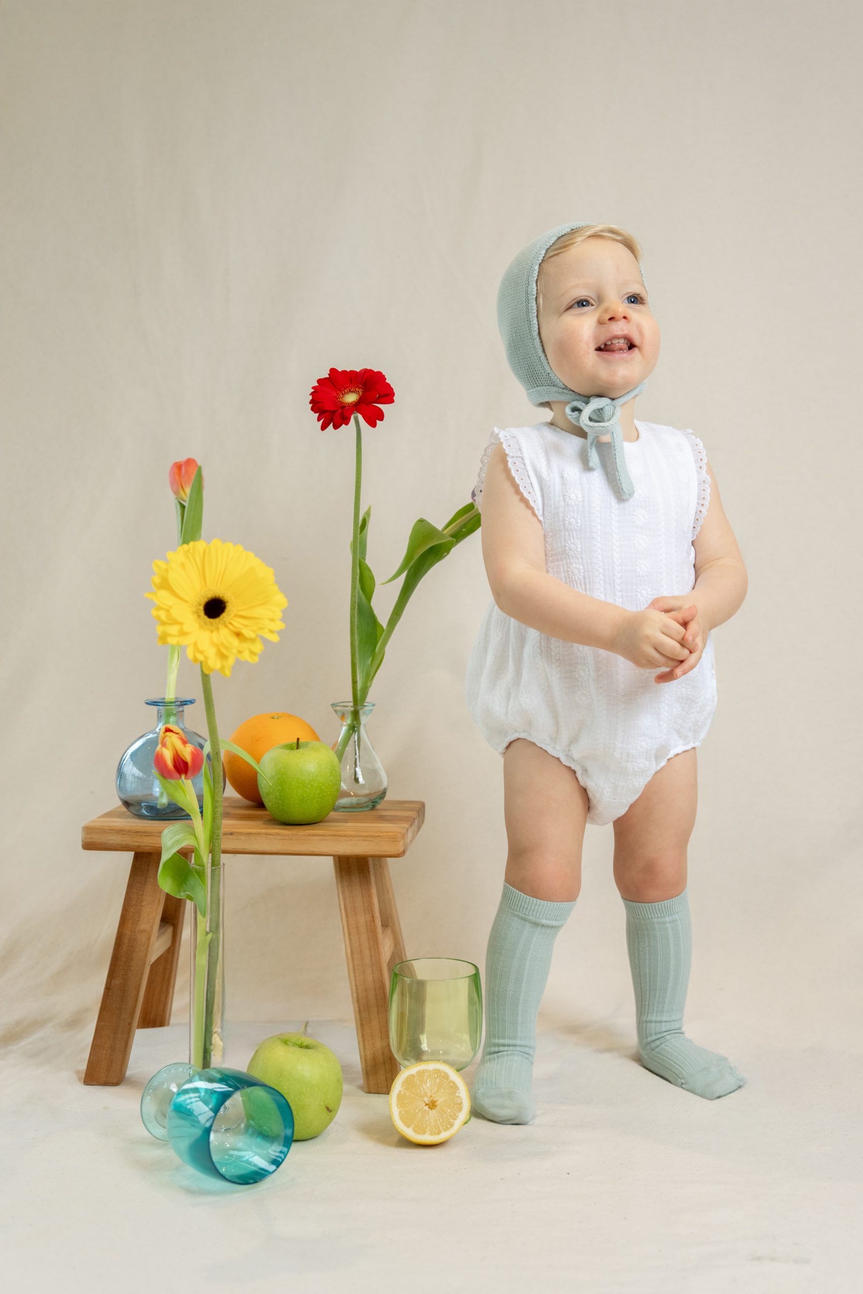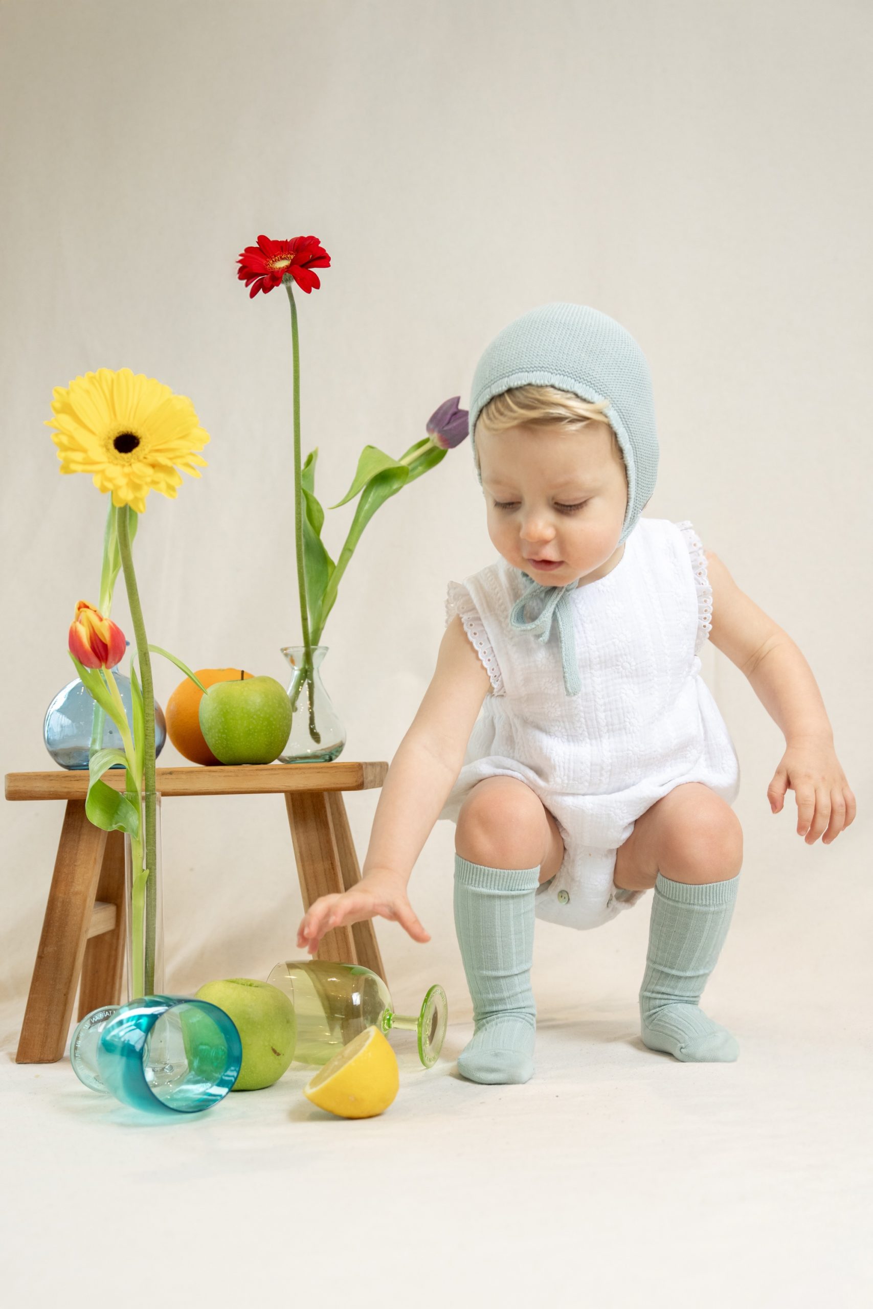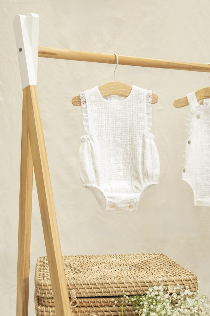 Tanto el puño como el muslo llevan goma blanda para no dañar la piel del bebé y lleva botones de nácar en la entrepierna para facilitar el cambio de pañal.