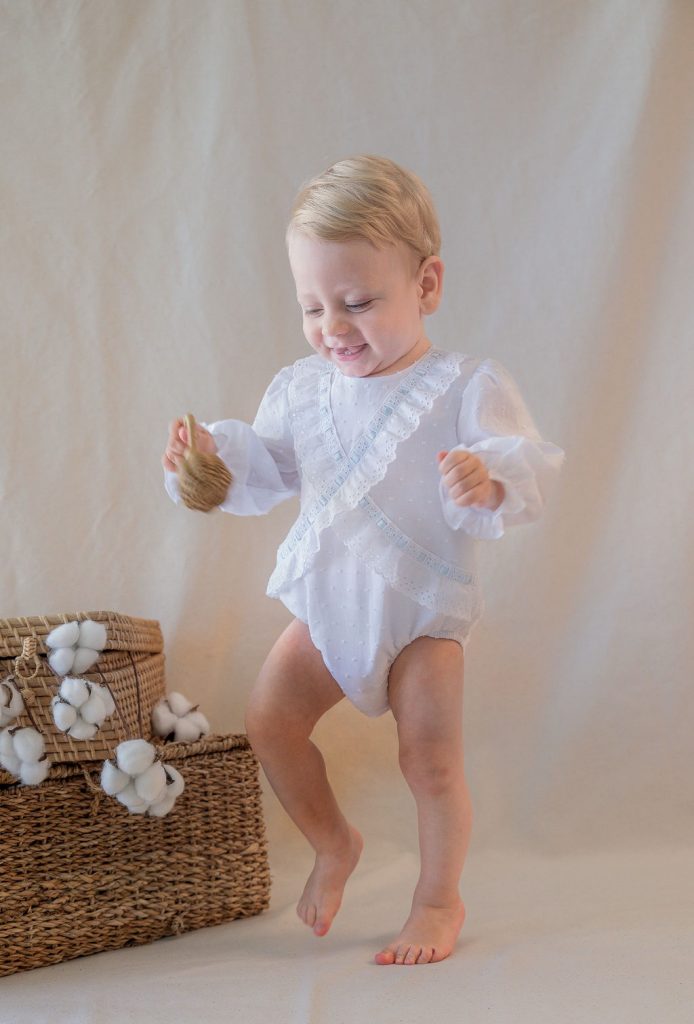 El muslo lleva gomas muy finitas que no aprietan a los bebés y lleva botones de nácar en la entrepierna para facilitar el cambio de pañal.