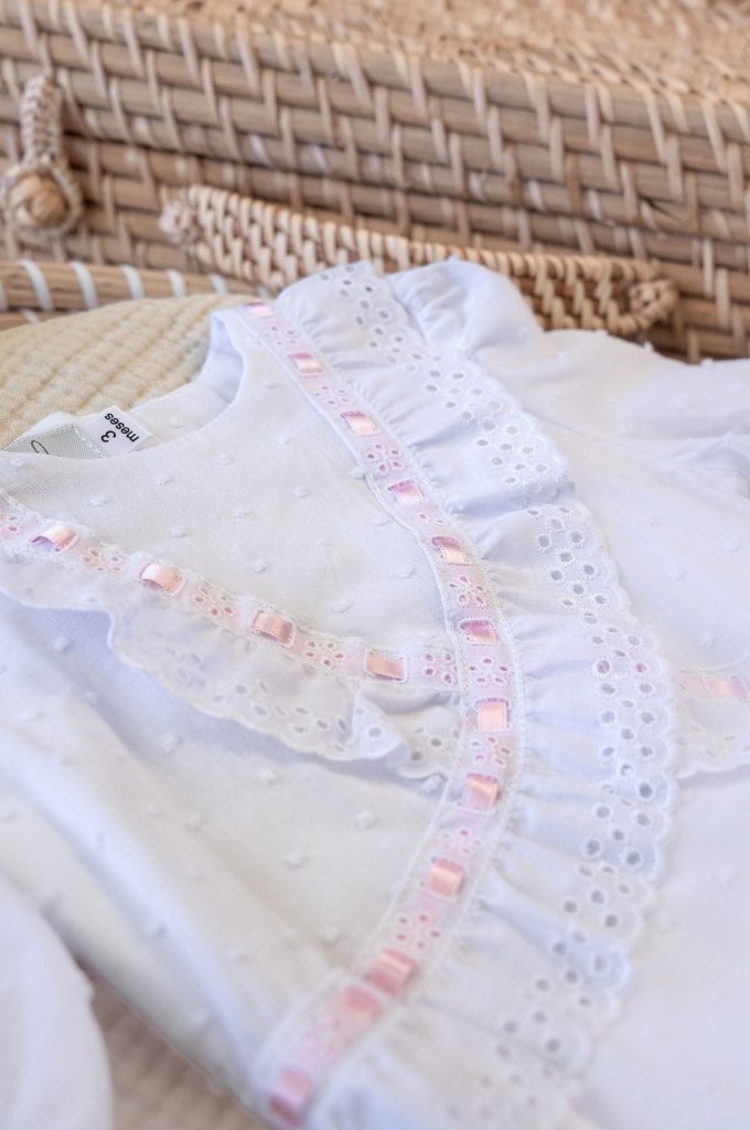 El muslo lleva gomas muy finitas que no aprietan a los bebés y lleva botones de nácar en la entrepierna para facilitar el cambio de pañal.