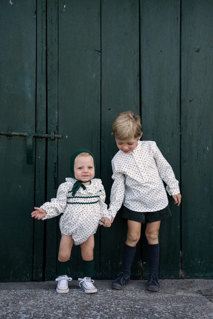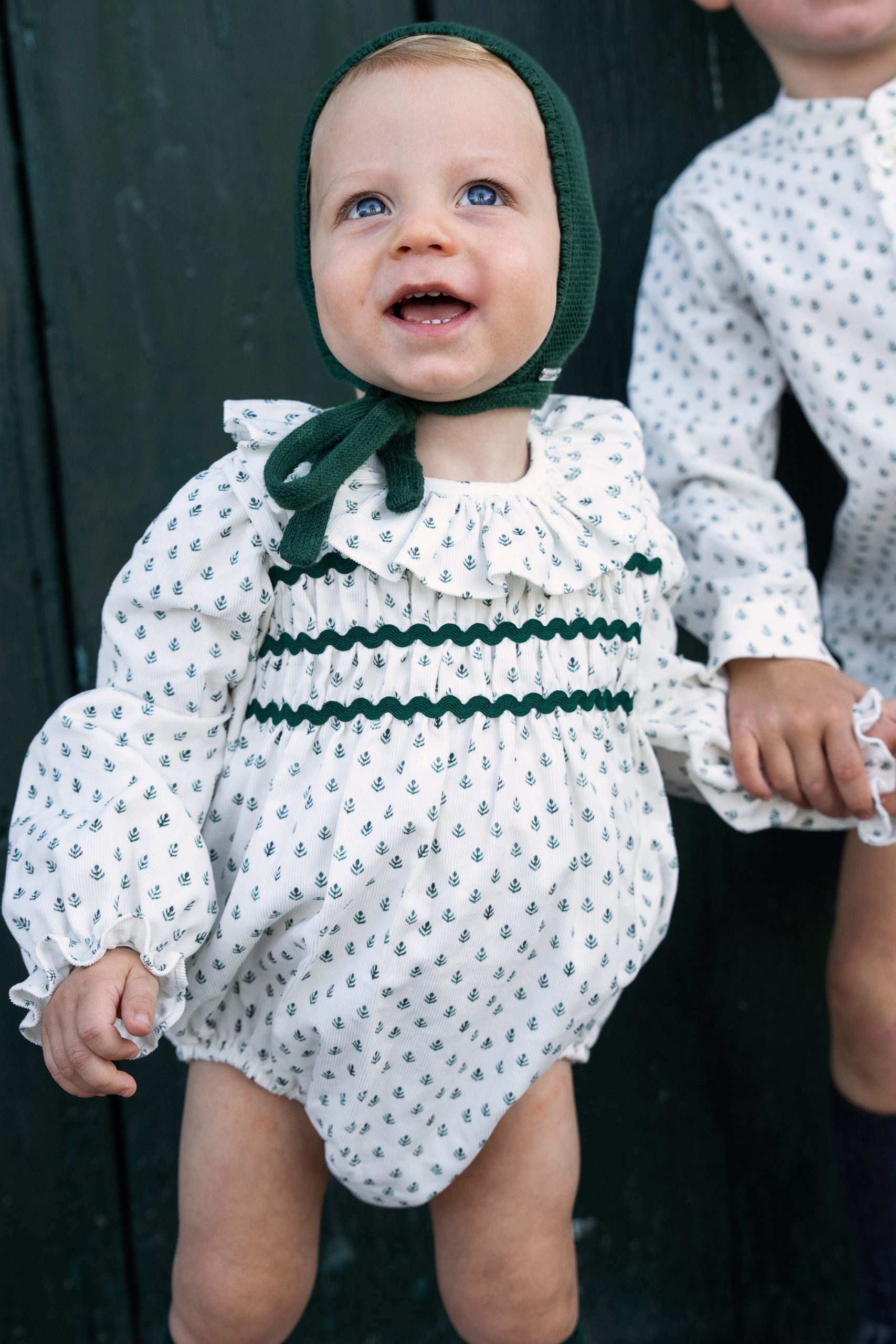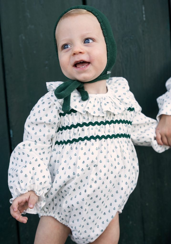 El muslo lleva goma blanda para no dañar la piel del bebé y lleva botones de nácar en la entrepierna para facilitar el cambio de pañal.