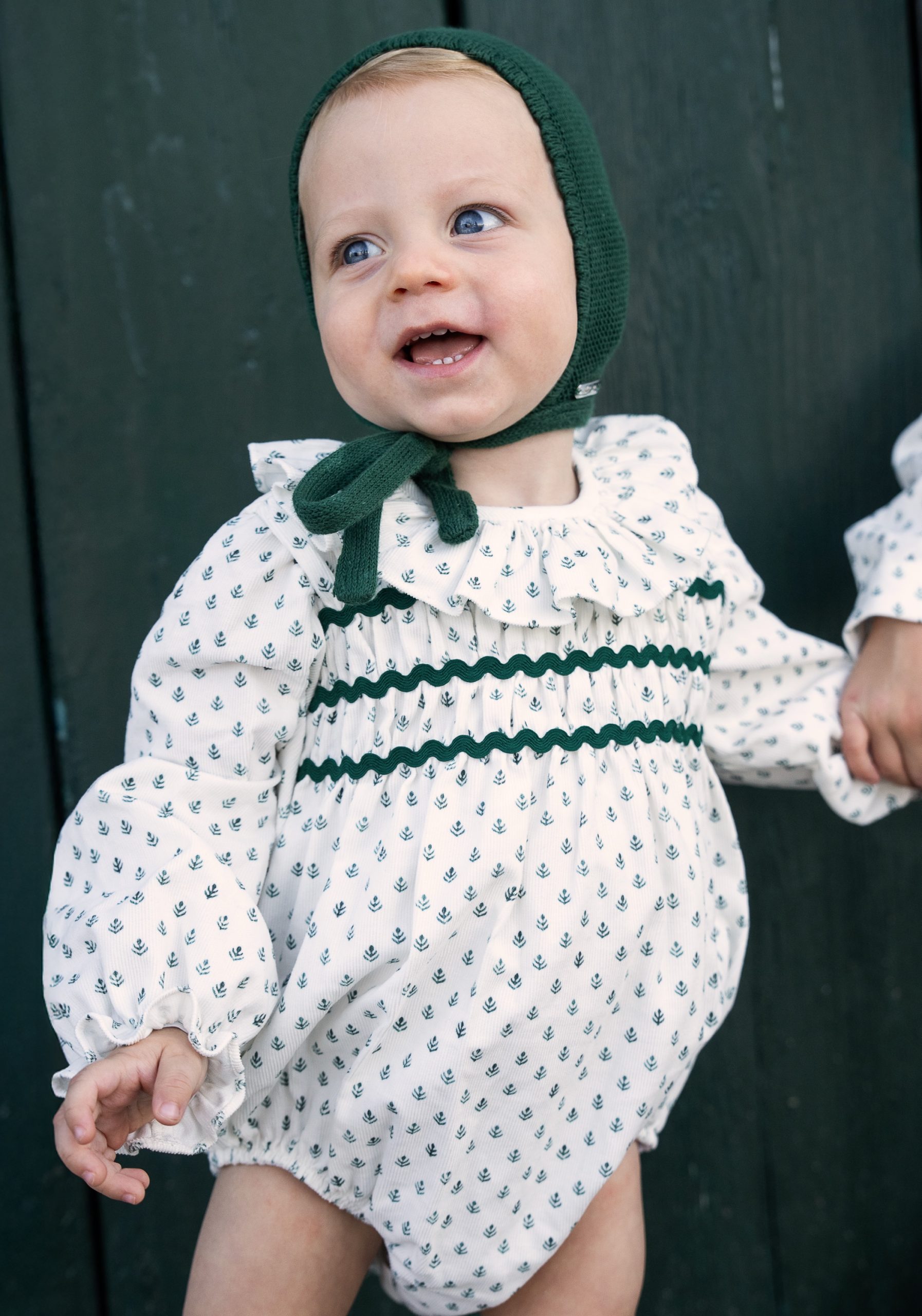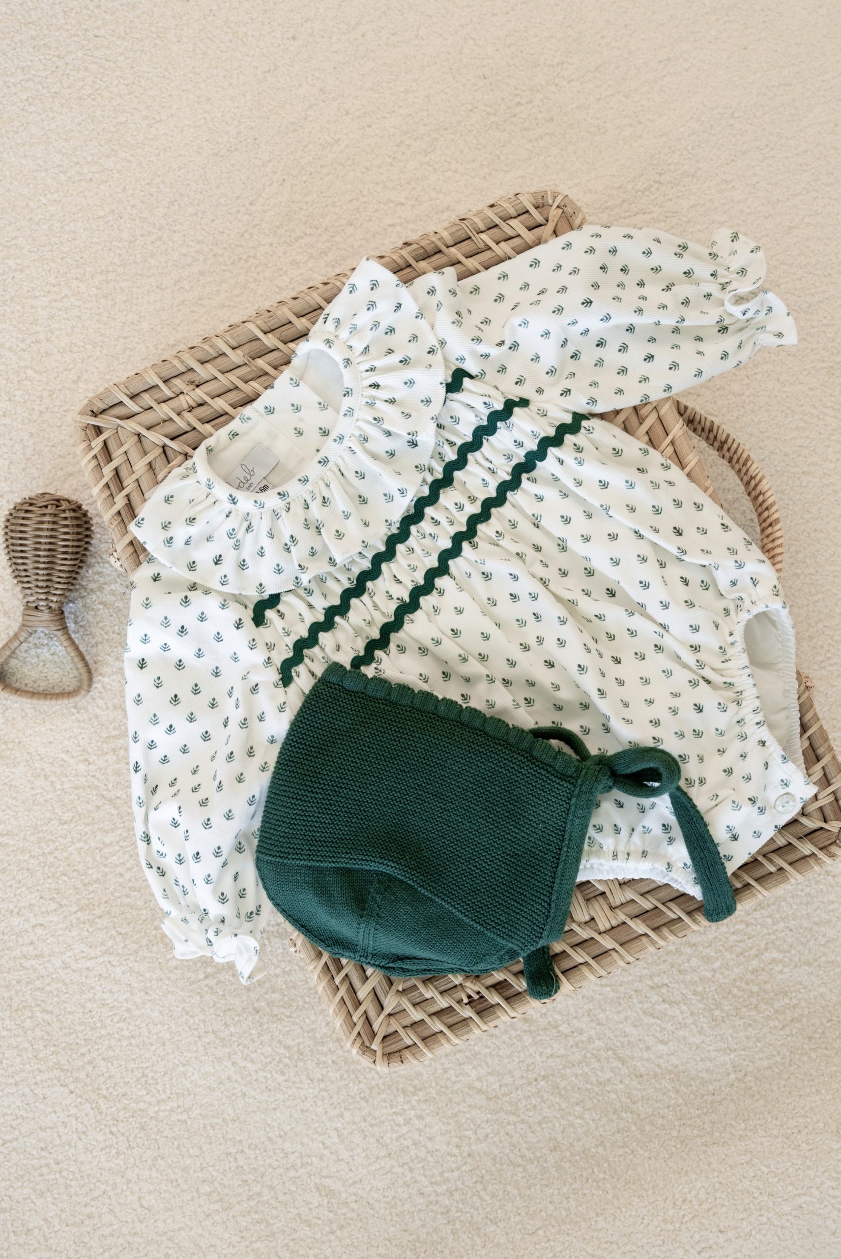 Cuello volante con detalle de frunces y ondulina verde botella. Se abrocha en la espalda con botones de nácar.