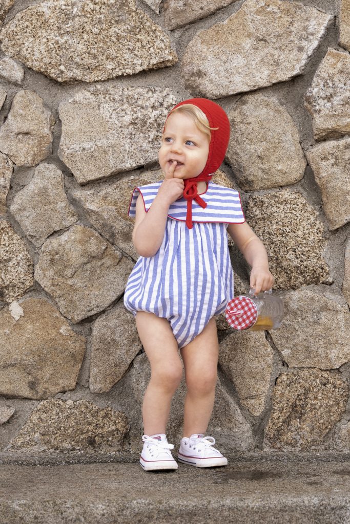 Destaca por su cuello marinero rematado con vivo en rojo. Se abrocha en la espalda con botones de nácar.