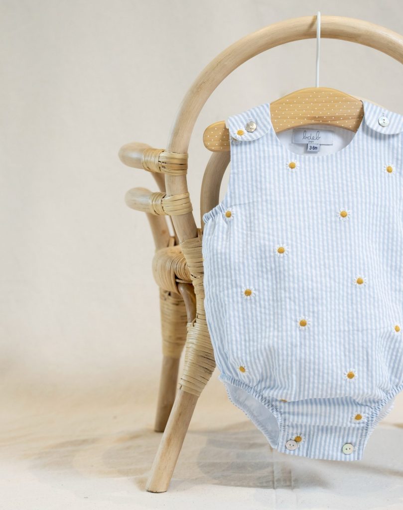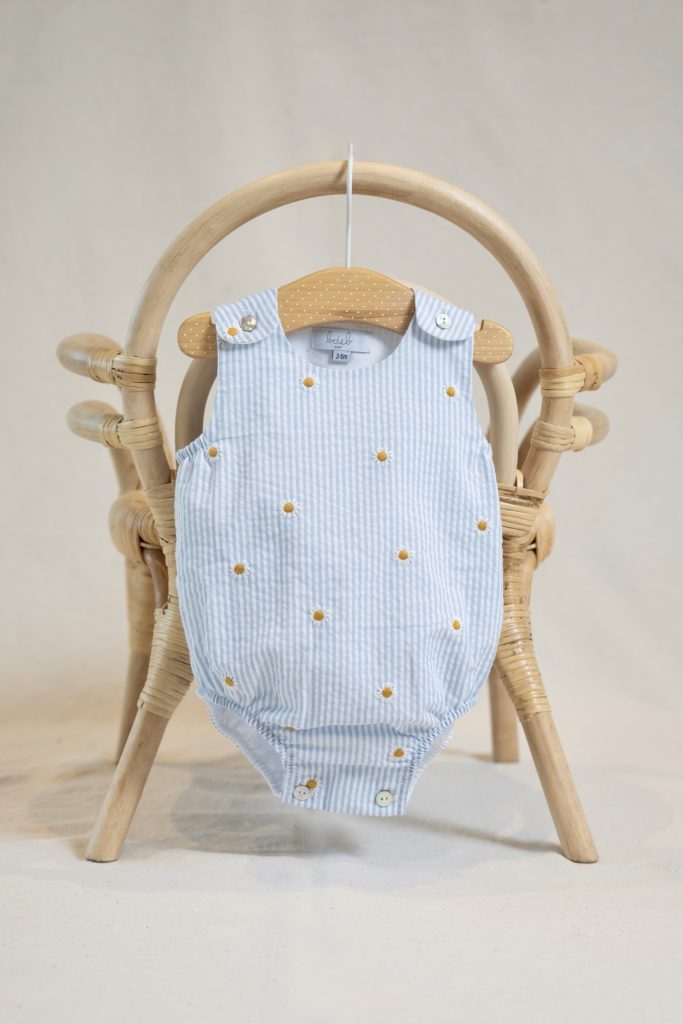 El muslo lleva goma blanda para no dañar la piel del bebé y lleva botones de nácar en la entrepierna para facilitar el cambio de pañal.