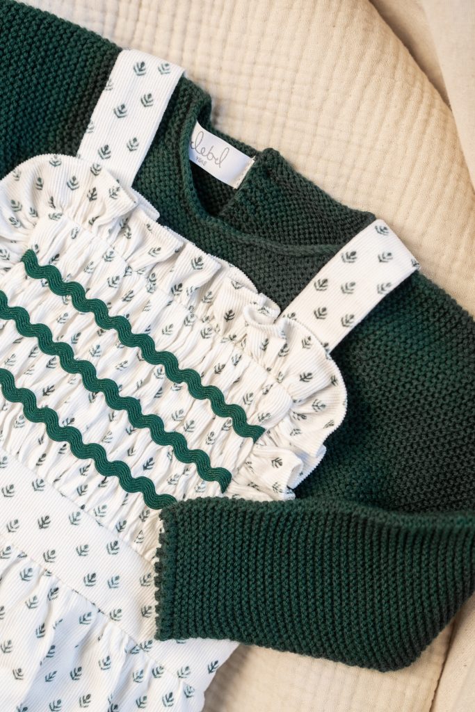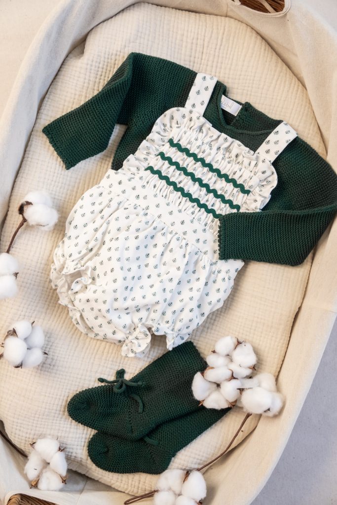 El muslo lleva goma blanda para no dañar la piel del bebé y lleva botones de nácar en la entrepierna para facilitar el cambio de pañal.